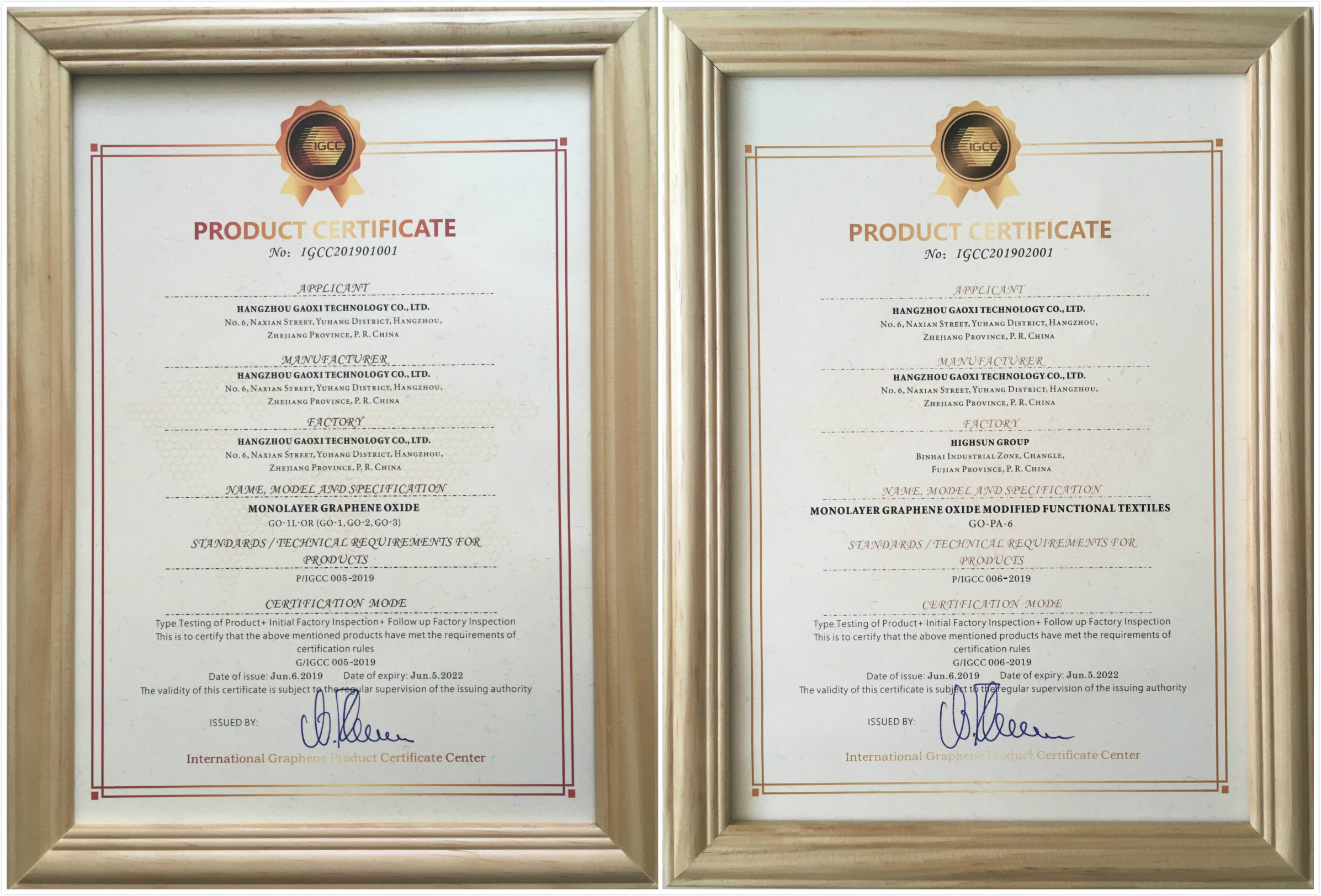 IGCC is an international independent third-party authoritative certification agency. Only throβugh sampling on site, comprehensive strict testing by the thirdπ party, and site quality control and audit, can the final certification be conducted. The s<pot sampling inspection shall be conducted at any time in the subsequent production to ensuπre the consistent high-quality. This is the first single-layer graphene oxide prod uct certification and the first multifunctional graphene composite fiber certification issu↔ed by IGCC. This is a small step forward of Gaoxi Tech, but also a big steπp in the innovation and development of graphene industry in the world.