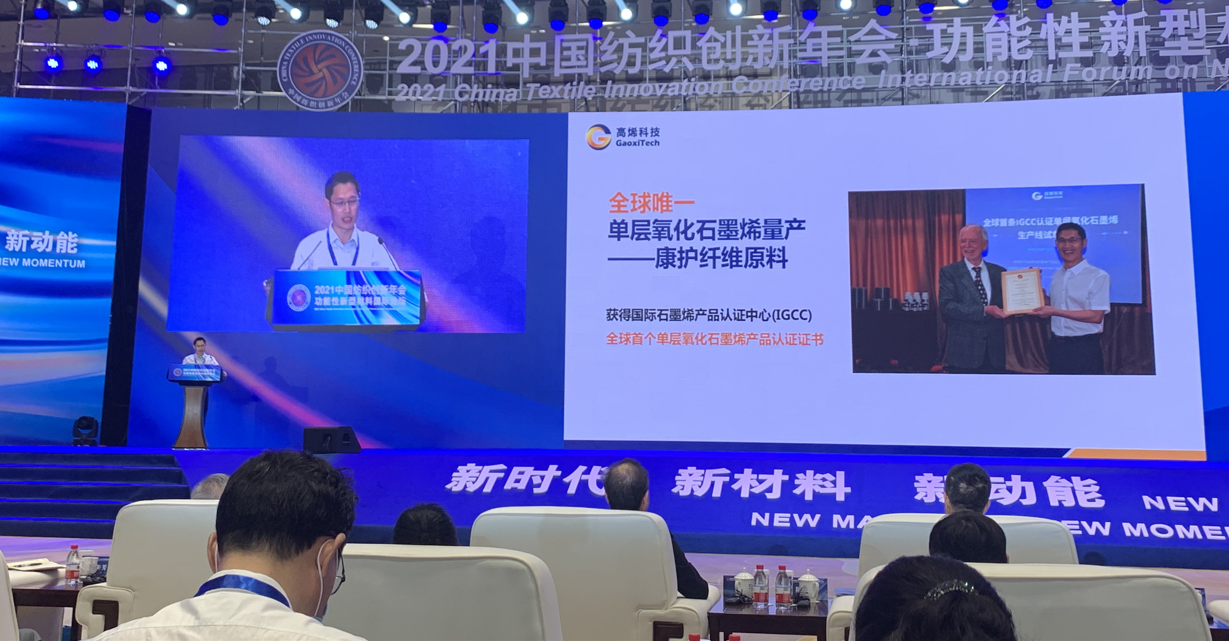 2021年(nián)5月(yuè)20日(rì),浙江大(dà)學高("gāo)分(fēn)子(zǐ)科(kē)學與工(gōng)程學系教授、杭州輕付科技有限公司首席科(kēα)學家(jiā)高(gāo)超,受邀參加“2021中國(guó)紡織創新年(nián)會(huì)·功能(néng)性新型材料國(gu¥ó)際論壇”,在功能(néng)性新型材料發展趨勢——科(kē)技(jì)論壇上(shàng)發表《石墨烯多(duō)功能(néng)康護纖維4.0》主題演講。